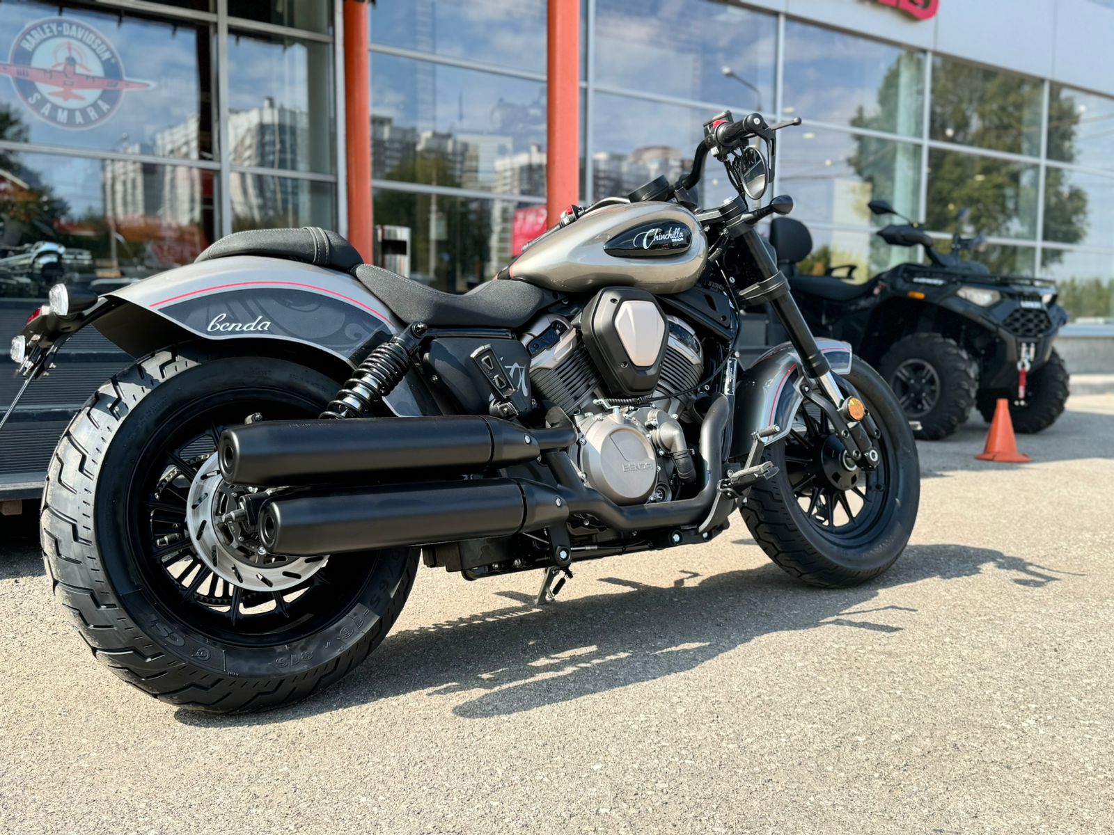 Benda Chinchilla 500 заметно крупнее своего 300-кубового собрата – длина колёсной базы увеличена до 1550 мм. Это позволило не только обеспечить максимальный комфорт райдера, но и предоставить пассажиру удобное полноразмерное сиденье. Глубокие крылья эффективно защищают экипаж от воды и пыли. Стильные глушители, выведенные на одну сторону, дополняют классический облик круизера, а установленные в торцах руля зеркала добавляют немного агрессии.