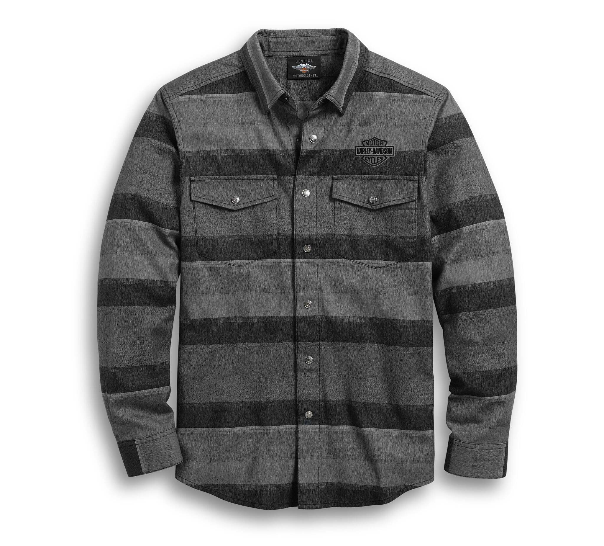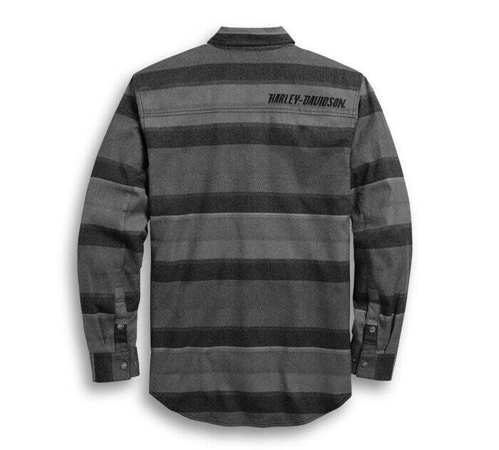 Мужская рубашка Harley-Davidson для высоких. Рубашка с горизонтальной полосой довольно стильная, с гладкой вышивкой в тон и полосами, идущими вразрез с обычным вертикальным положением