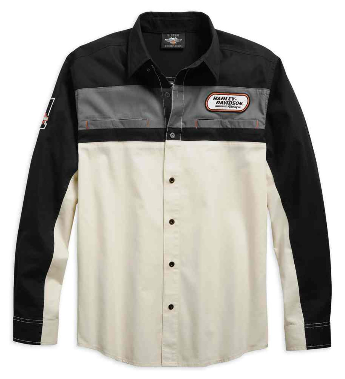 Рубашка Harley-Davidson. Изготовлен из 100% хлопчатобумажной саржи. Воротник на кнопках. Пуговицы спереди и манжеты. Нагрудные карманы на кнопках. Вышитые патчи и графика