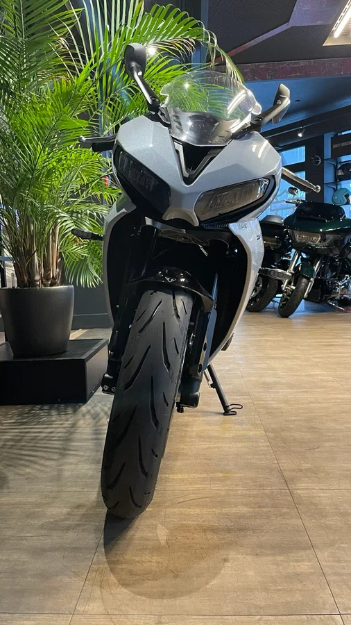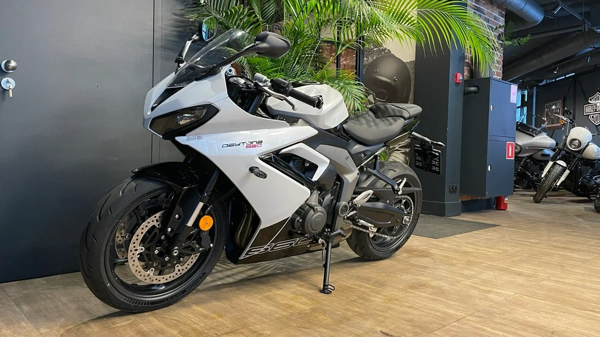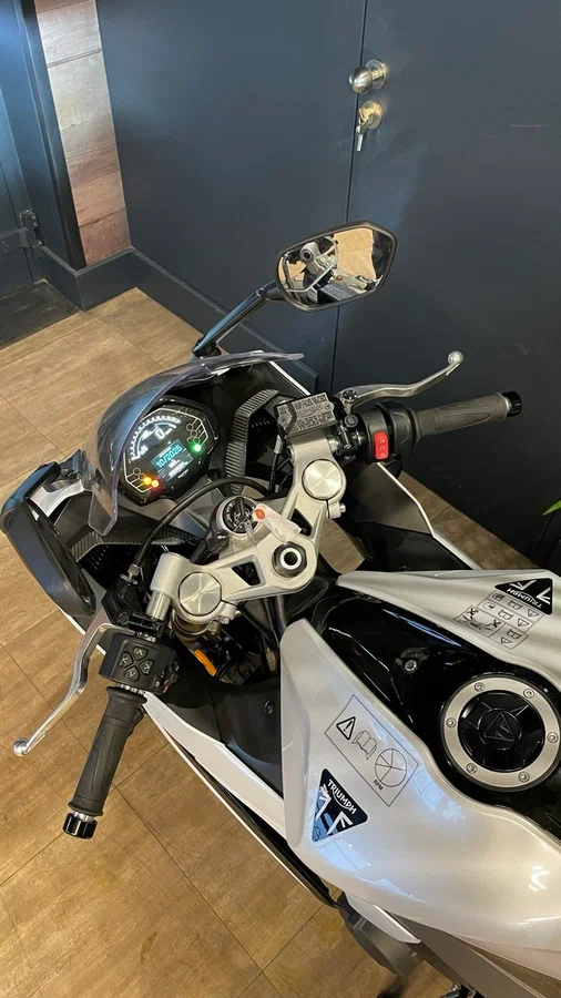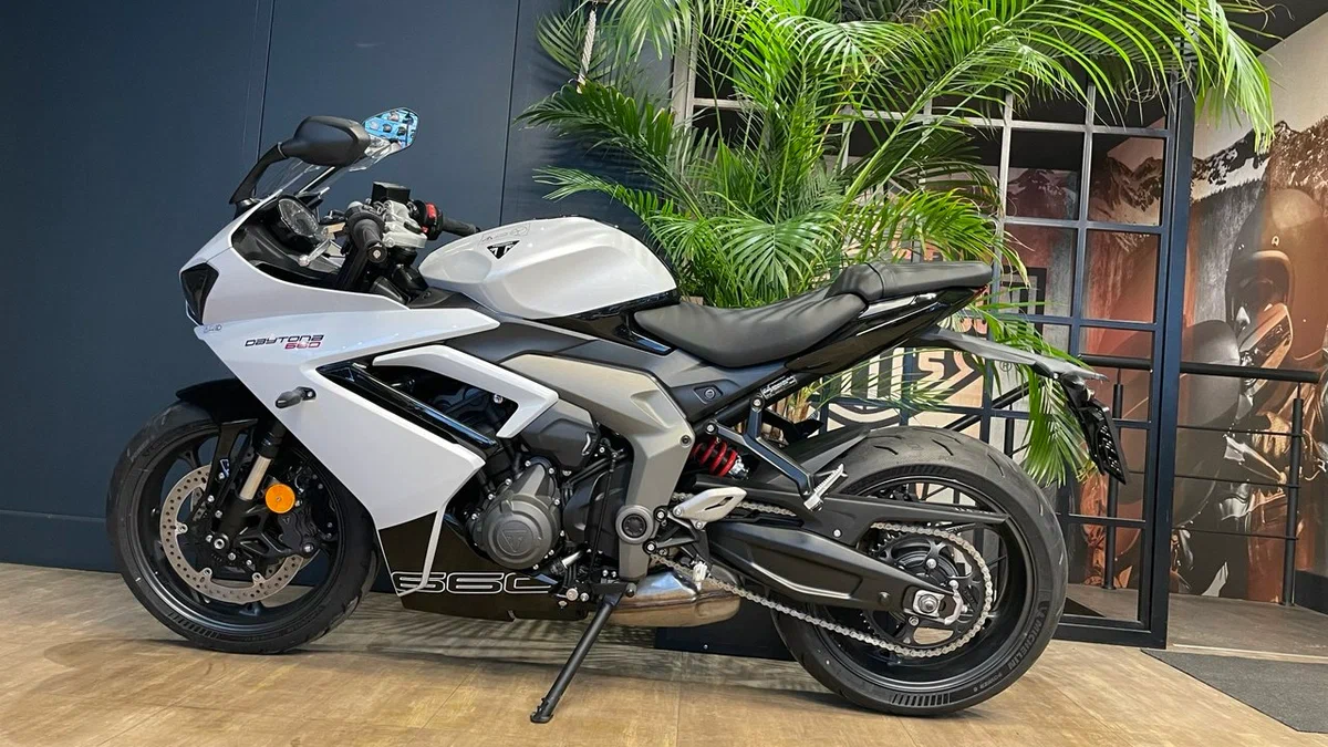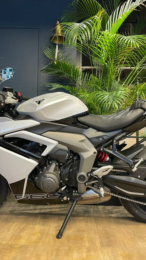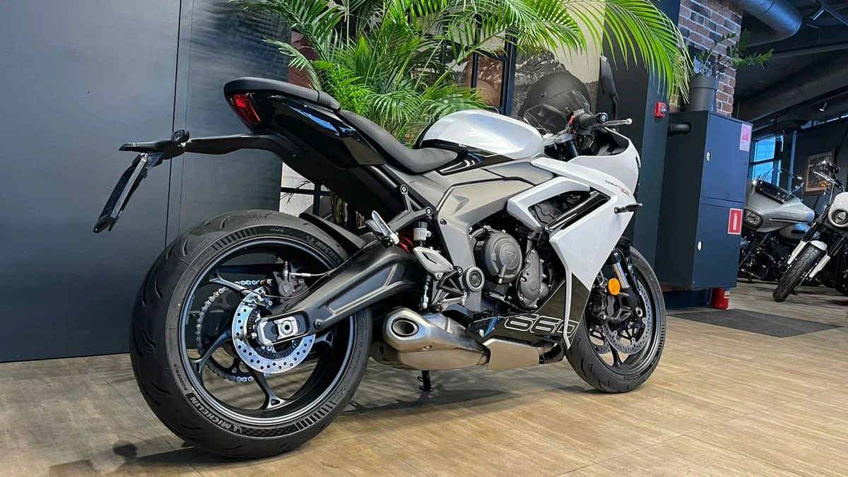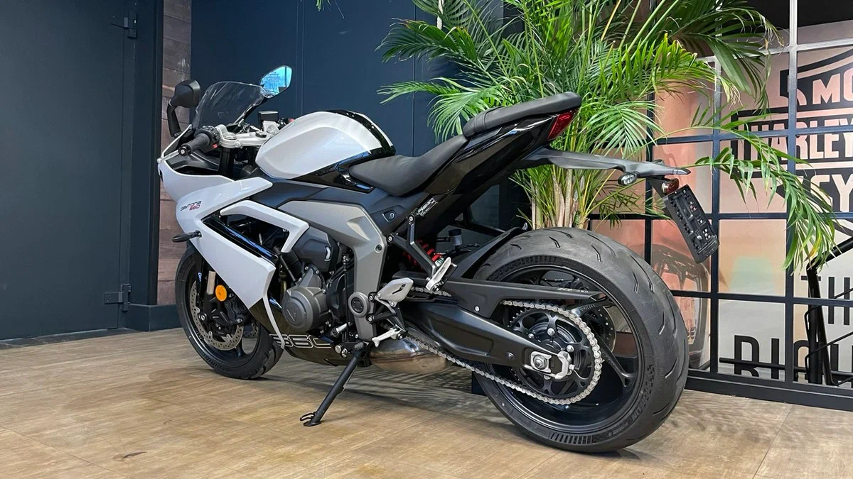 По данным Triumph, эти доработки и повышение оборотов отсечки до 12650об/мин позволили увеличить пиковую мощность Daytona 660 до 95лс на 11250об/мин - это на 17% выше, чем у Trident. Поднялся и крутящий момент, на пике достигая 69,1Нм на 8250об/мин, а кроме того, более 80% тяги доступно с 3125 по 11750об/мин.